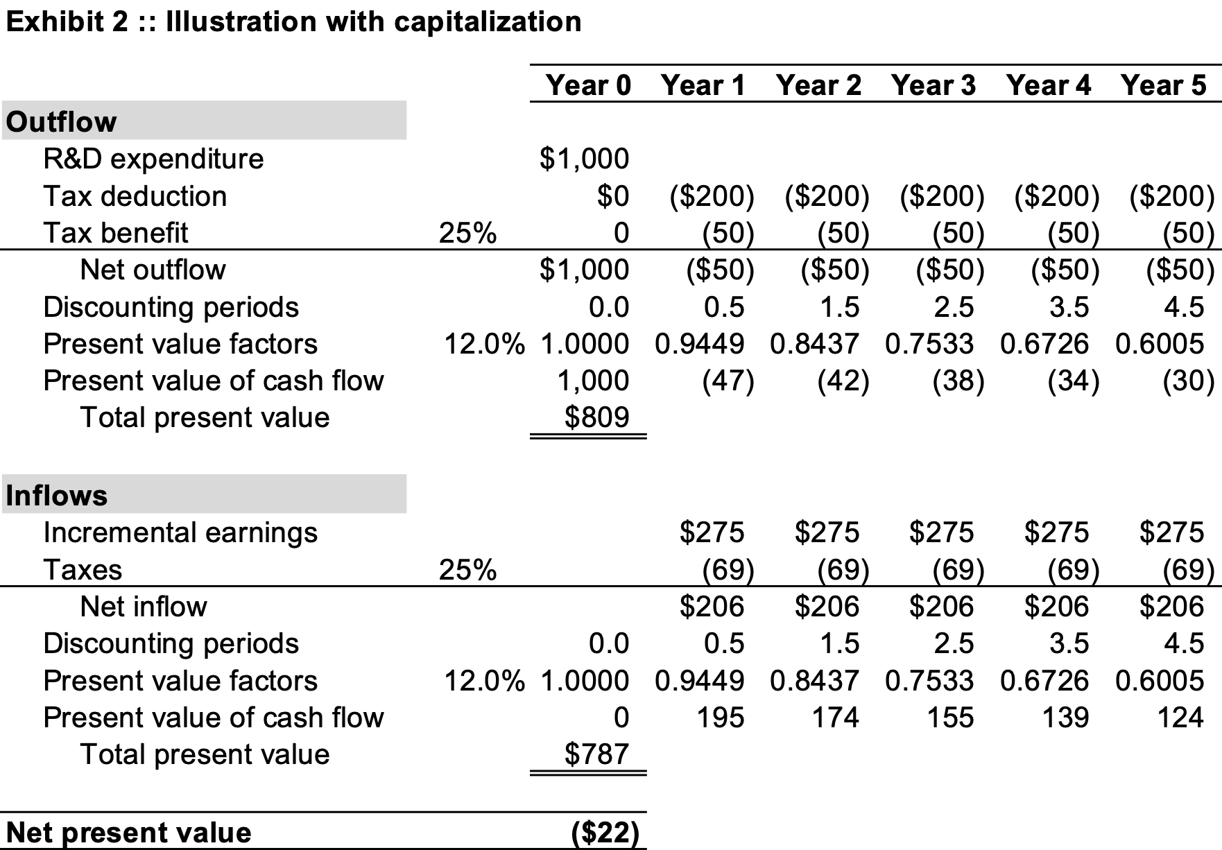 The present value of the cash inflows is unaffected; however, the deferral of tax benefits from deductibility increases the present value of the after-tax cash outflow. As a result, the net present value turns negative, indicating that the project would detract from the value of the family business. In this simple example, the required capitalization of R&D spending caused the net present value to go negative. The economics of real projects are rarely so transparent. Nonetheless, the point is that capitalizing R&D expenditures for tax purposes detracts from the financial feasibility of proposed R&D projects.