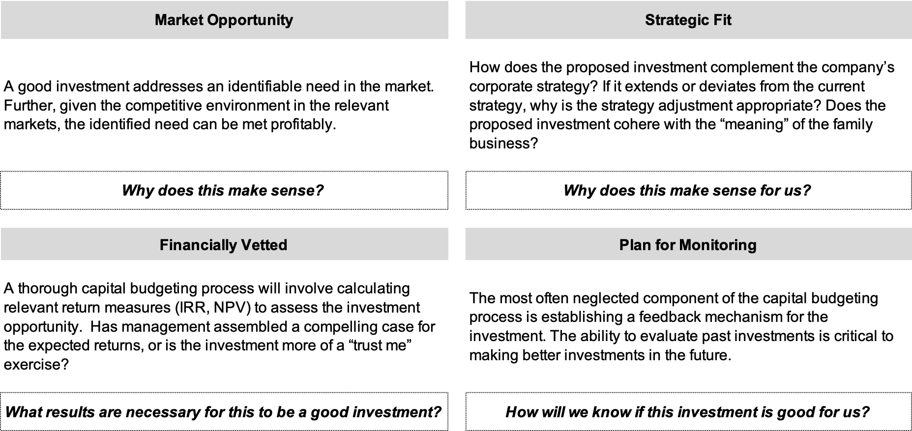 In addition to minimum hurdle rates, there is also the constraint of limited family capital. You may face multiple options that exceed your company’s hurdle rate or WACC. What then? We see family businesses make good investments by focusing on four areas: market opportunity, strategic fit, financial vetting, and success monitoring. We detail these areas in Figure 3 below.