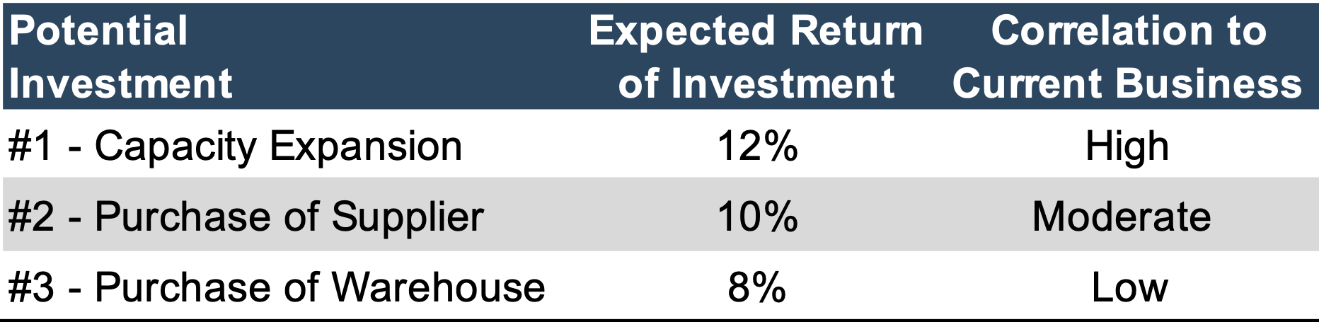There is no unambiguously correct choice for which investment to make. While the capacity expansion project offers the highest expected return, the close correlation of the returns to the existing business indicates that the project will not reduce the company's risk—or variability of returns. At the other extreme, the warehouse acquisition has the lowest expected return, but because the returns on the warehouse are essentially uncorrelated to the existing business, the warehouse acquisition reduces the overall risk profile of the business. The correct choice in this case should be made with respect to the shareholders' risk tolerance and how the investments fit the business strategy.