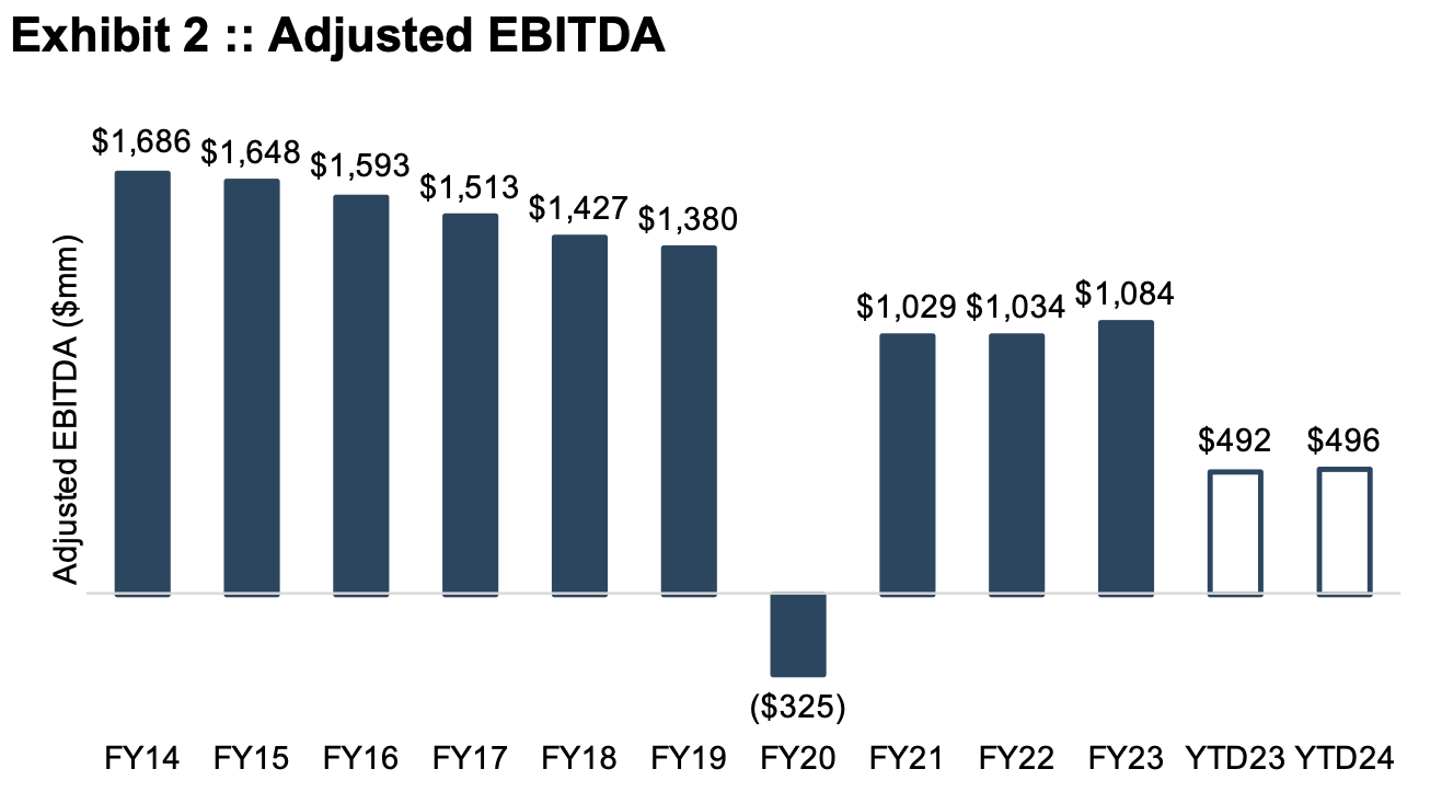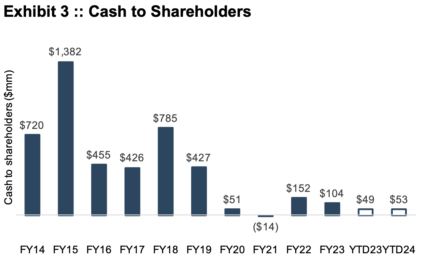 In short, the downtrend was evident at the time of the $50 per share offer in March 2018. While EBITDA has stabilized in the wake of the pandemic, the new “ongoing” level of EBITDA for the company is 21% below the pre-pandemic level. Moreover, against ongoing capital investment needs, cash flows distributed to shareholders (whether through dividends or net share repurchases) have dwindled even more dramatically over the period, as shown in Exhibit 3.