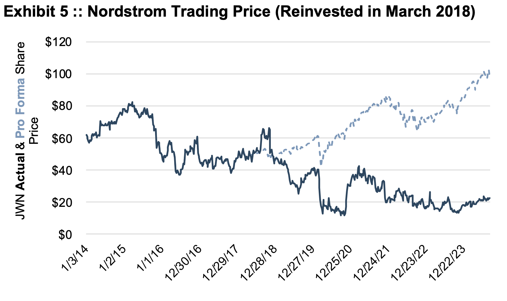 Nordstrom was in the news again this week, with the company disclosing that — once again — members of the Nordstrom family were offering to take the company private, this time for $23 per share. As of the writing of this post, the Nordstrom board had formed an independent committee to evaluate the offer. The $23 per share offer compares to an average trading price for Nordstrom shares of approximately $22 per share during August 2024. Prior to the reporting of a potential buyout offer in April 2024, the shares were trading in the neighborhood of $18 per share. It’s certainly not our place to second guess the Nordstrom board, but in hindsight, JWN shareholders undoubtedly regret the refusal of the $50 offer in March 2018 and the (unspecified) purchase offer in the fall of 2019. Exhibit 1 depicts Nordstrom's share prices since 2014.