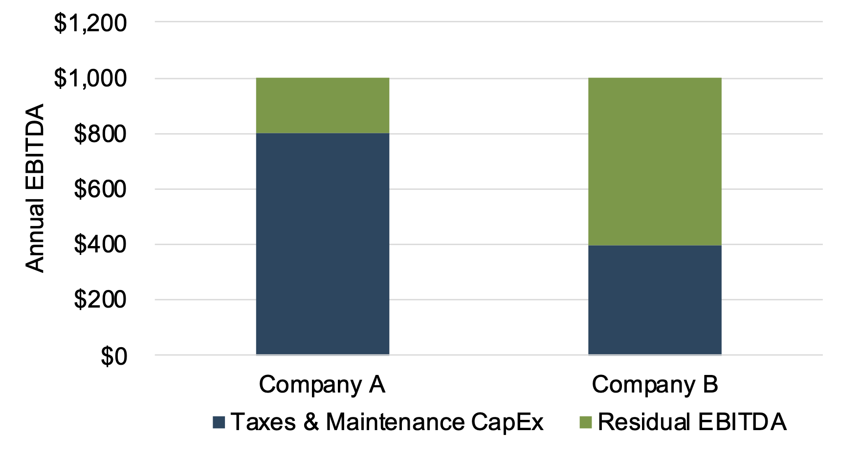 Importantly, only three of these five uses provide direct returns to capital providers: paying interest, repaying debt, and distributing to owners. The other two, paying taxes and capital expenditures, do not directly accrue to the benefit of shareholders. This is generally obvious regarding taxes but requires more finesse for capital expenditures. We can divide capital expenditures (in the economic rather than accounting sense) into two groups: Maintenance Capital Expenditures – Family businesses focused on sustainability recognize that a portion of operating cash flow must be set aside each year to maintain productive capacity. Depreciation expense is an imperfect proxy for this obligation. The reality of this maintenance capex burden lies at the heart of Buffet’s infamous tooth fairy warning on EBITDA. Growth Capital Expenditures – But not all capex is maintenance capex. Family businesses also invest to grow (whether through M&A or organic investments). Since these investments should only be made if the expected returns exceed the company’s cost of capital, these “elective” expenditures are made in lieu of distributions to capital providers in the expectation that they will generate long-term benefits that more than make up for the deferral in distributions. The point of all this is that a dollar of EBITDA is not just a dollar of EBITDA. The quality of a dollar of EBITDA depends on how much of that dollar is allocable to taxes and maintenance capital expenditures. Consider the two companies summarized in the following chart.