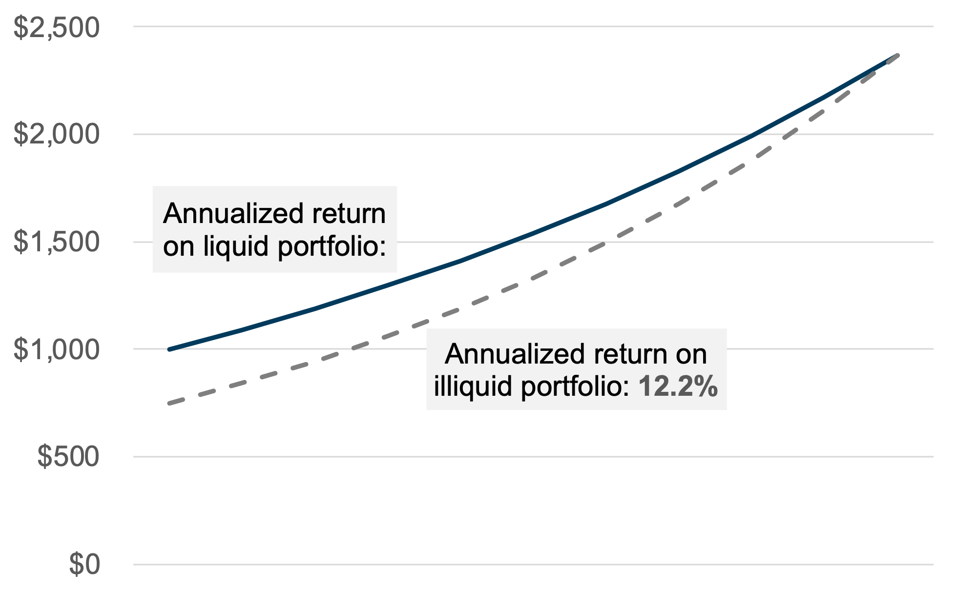 • The second investor does not need or value liquidity and is therefore willing to invest in a portfolio of assets of comparable risk but for the absence of a ready trading market. By accepting the attendant illiquidity, she can acquire her portfolio for $750,000 (a 25% discount to the freely traded portfolio).  If the performance of the underlying assets is the same (i.e., grows to $2.4 million over ten years) and she can sell the portfolio on an undiscounted basis at that point, her annualized return is 12.2%.