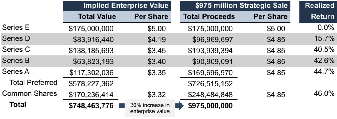 Let’s return to the BlueCo example to illustrate. Assume that the appropriate assumptions for BlueCo from the sensitivity table above are three years to exit, implying an enterprise value of $748 million. In the year following the Series E investment, BlueCo management executes its strategy successfully, causing the enterprise value to increase 30% to $975 million. If BlueCo exits via a strategic sale at that point, none of the incremental enterprise value will accrue to the Series E investors; despite identifying an attractive company, and the strong execution of management, the Series E investors will receive their capital back with no return.