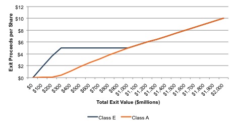 Even under the relatively disappointing $400 million exit scenario, the Scenario E shareholders are entitled to return of their investment, or $5.00 per share, while the proceeds to more subordinate classes range from $1.14 per share to $3.00 per share. The following chart depicts the superiority of the proceeds for Series E preferred shares to Series A shares over enterprise exit values less than $1.0 billion: