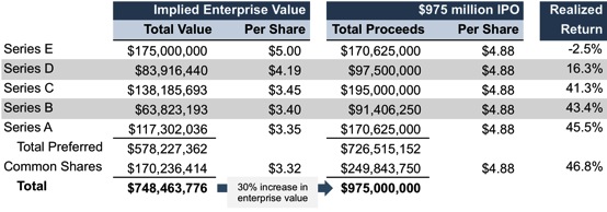 If the exit occurs instead by IPO, things get even more awkward. In contrast to a strategic sale, an IPO is a pro rata exit, meaning that the realized return for the Series E preferred investors will actually be negative, despite the 30% increase in enterprise value. Further, the Company and its management team will likely be subject to some unfavorable press for executing a "downround" IPO, although in reality, it generated a handsome return for the investor group as a whole.