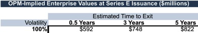 Over the range of exit timing assumptions noted above, the implied total enterprise value ranges from less than $600 million to just over $800 million, meaningful discounts to the $1 billion headline number. The reliability of the OPM and the assumed inputs can be debated; however the point remains that, since the subordinate classes are necessarily worth less than Series E, the total enterprise value is less than $1 billion.