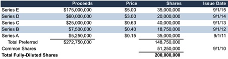 Consider the following example. The capitalization of a hypothetical freshly-minted unicorn, BlueCo, is summarized in the following table: