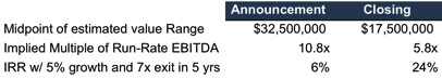 Back in December, we blogged about Tri-State Capital’s recently announced acquisition of $2.6 billion manager, The Killen Group of Berwyn, PA. The deal terms included an initial $15 million payment and contingent consideration of 7x any incremental growth in Killen’s annual run rate EBITDA in excess of $3 million for the pending calendar year (2016). Upon announcement, the estimated total deal value was in the $30-$35 million range, but when the deal closed in April, this estimate dropped to $15-$20 million. The table below illustrates the implied valuation metrics and returns had this deal been structured as a one-time payment under the two value scenarios.