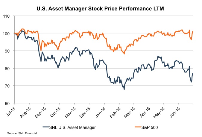 The headline performance comparison is striking. Over the past twelve months, while the S&P 500 rose modestly, the SNL U.S. Asset Manager index underperformed by over 24%.