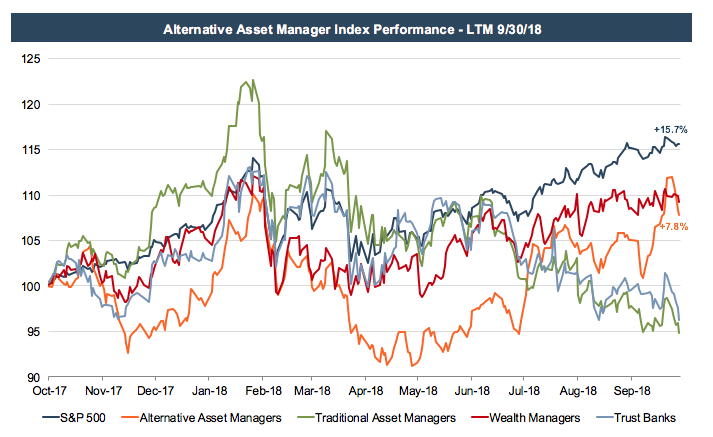 Alternative investment managers took off in the wake of the financial crisis when investors flocked to risk mitigating strategies and uncorrelated asset classes; however, during 2015 and 2016 these businesses floundered against a backdrop of strong equity market performance. Alt managers bounced back in 2017, and over the last twelve months, have continued to perform well. Despite improving performance over the last two years, the industry continues to face a number of headwinds, including fee pressure, expanding index opportunities, and relative underperformance.