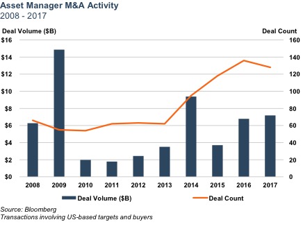 Asset manager M&A remained robust in 2017 against a backdrop of rising markets and higher AUM balances for most industry participants. Total (disclosed) transaction value was up 6% from 2016 levels despite a 6% reduction in the number of deals. Several trends, which have driven the uptick in sector M&A, have continued into 2017, including revenue and cost pressures and an increasing interest from bank acquirers.