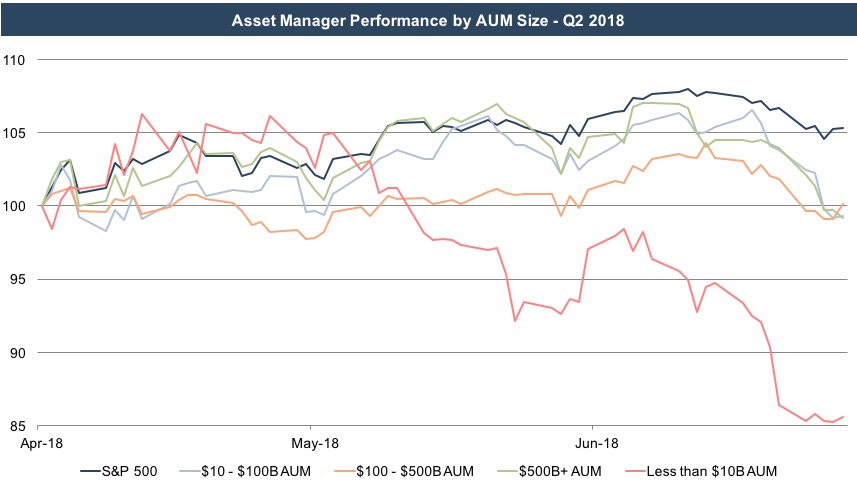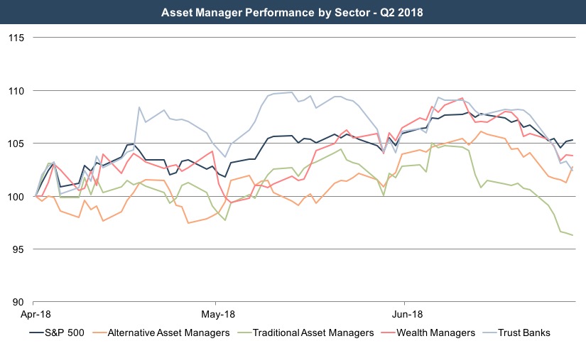 Perhaps reflective of the headwinds that the industry faces, asset managers generally underperformed broad market indices during the second quarter. While major indices regained traction during the second quarter, the returns for asset managers were generally more muted even though these businesses generally benefit from rising markets. The operating leverage inherent in the business model of most asset managers suggests that market movements tend to have an amplified effect on the profitability (and stock prices) of these businesses, and in recent quarters that has been the case. The reversal of that trend last quarter may be indicative of investors’ increasing focus on the headwinds the industry faces and the general uncertainty that arises late in the economic cycle.