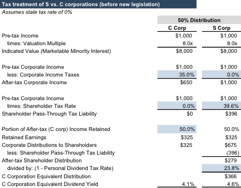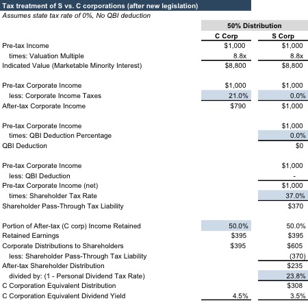 Before the Trump Tax Bill, it often made sense to structure investment management firms as tax pass through entities – usually S corporations or LLCs. As shown in the table below, given taxable income of, say, $1 million, a C corporation would only have $650 thousand to distribute after paying federal corporate taxes at a rate of 35%. Even though the same $1 million of taxable income would be taxed at a higher personal rate for S corporation shareholders, the after-tax distribution of $604 thousand would have a higher economic value when you consider S corp shareholders skip the dividend tax (paid at 23.8%) that would accrue to the C corporation shareholder. After grossing up the after-tax dividend to the S corp shareholder at the C corporation dividend tax rate, the S corporation shareholder earns a C corporation equivalent dividend of nearly $800 thousand. Assuming the RIA in this example is valued at 8x pre-tax income, the S corp shareholder experiences a distribution yield that is 180 basis points higher than if his or her RIA were structured as a C (all else equal).