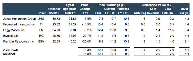 Don’t interpret this as our being bearish on asset management.  Almost every asset management firm, public or private, is more valuable today than it was in 2009.  The explanation for that is simple: rising markets lead to higher AUM, management fees, and earnings, so many of these businesses are worth 2-3x (or more) what they were a decade ago because profitability has (easily) tripled in the last nine years.  As appraisers, we’re more concerned with the multiple (i.e. valuation) applied to these earnings since that’s what we take from the market and relate to our client company’s performance to derive value.  Here’s how the market is currently pricing some of these businesses:
