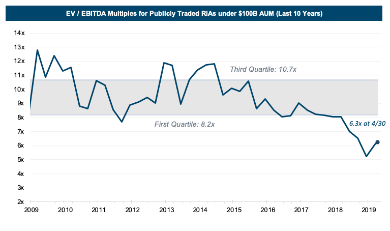 One of my colleagues at Mercer Capital, Zach Milam, has been keeping an eye on EBITDA multiples for smaller money managers. He updated the chart below through the end of April.