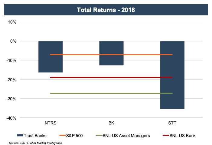 Trust banks have generally lagged the broader indices since the financial crisis of 2008 and 2009. Against a bearish backdrop for the industry, all three trust bank stocks declined in the last few months of the year with falling client asset balances and rising labor costs.