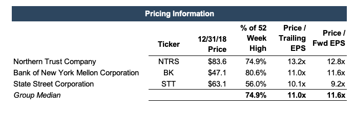 Despite trust banks’ underperformance during 2018, investment management fees increased year-over-year (as of the third quarter, the most recent information available). Servicing fees varied by company. State Street saw a decline in serving fees due to what it explains as “client transitions and challenging industry conditions.” BNY Mellon’s fees were relatively flat and Northern Trust saw an increase in servicing fees partially due to the UBS fund administrator acquisition which closed in late 2017. But, as a whole, trust banks saw improved net interest margins due to higher U.S. market interest rates and increases in trading services with the recent uptick in volatility.