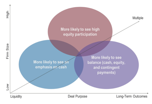 While the deal multiple is a convenient short-hand way to summarize a transaction, as the chart above suggests, it does not tell the full story. Still, the deal price and multiples are what makes the headlines (if terms are publicly disclosed at all) because the nuances of an earn-out arrangement don’t make for an exciting press release.