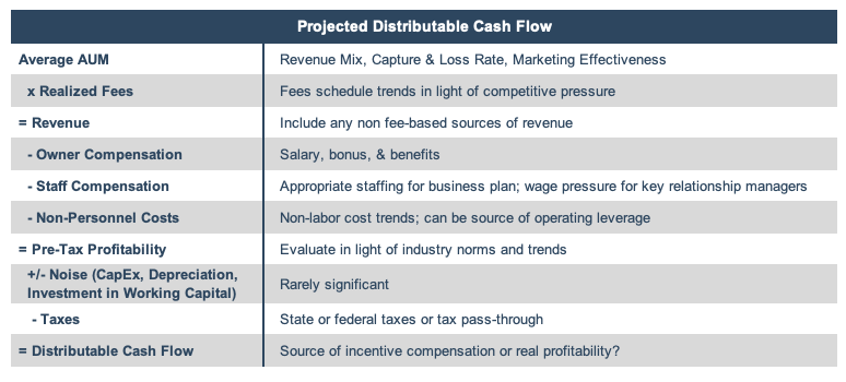 The base rate of profitability is determined by a wealth manager’s current revenue and cost structure, with possible adjustments made.  It is often said that wealth managers generate revenue while they sleep, as revenue is a function of assets under management and is typically not performance or commission based.  The fee-based revenue model used by most wealth management firms allows us to determine an ongoing (run rate) level of revenue by multiplying assets under management at any given day by the business’ average realized fee structure.