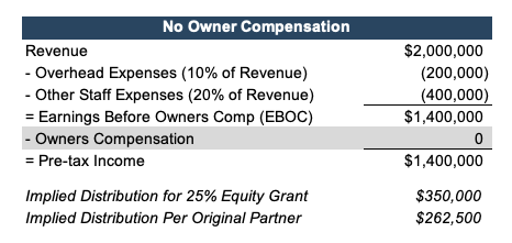 Take the example below of an RIA with four partners with equal ownership considering a 25% equity grant to bring on a new partner who will help the company expand its reach. To minimize their tax burden, the owners historically have not paid themselves a salary and instead were compensated through distributions. However, if they bring on a new employee with a salary and 25% ownership, the new partner would receive higher compensation (including distributions) than the original partners who aren’t taking any salary or bonus.
