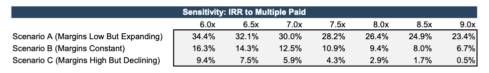 The sensitivity table below shows the buyer’s IRR in each scenario as a function of the multiple paid.1 For a given multiple, the IRR is highest in Scenario A (margins low but expanding) and lowest in Scenario C (margins high but declining). In Scenario A, the buyer can afford to pay a higher multiple and still generate an attractive rate of return (a 9.0x multiple results in an IRR of 23.4%). In Scenarios B and C, however, the buyer must pay a lower multiple in order to generate the same IRR, even though the initial margin is higher.