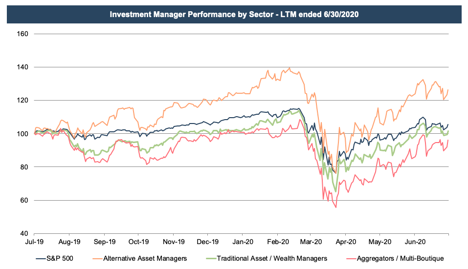 It probably doesn’t feel like it, but most RIA stocks are up over the last year. Over this time, we’ve had two bull markets and one bear market in one of the most volatile twelve-month periods that I can remember. This volatility has been especially beneficial to alternative asset managers since hedge funds are usually well-positioned to take advantage of variability in security prices. The aggregators are the only segment of RIAs that are down over the last year since their models rely on debt financing, which exacerbated their losses during March’s sell-off.