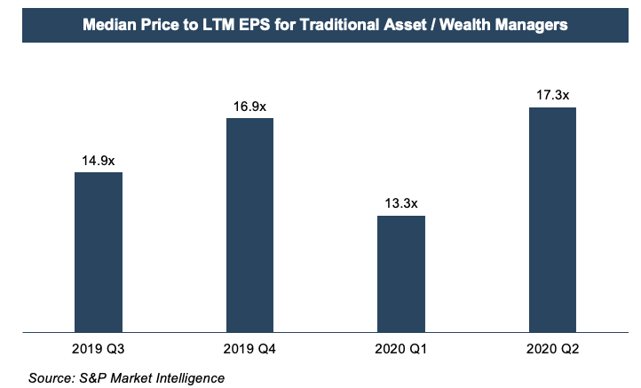 There are a number of explanations for this variation. Earnings multiples are primarily a function of risk and growth, and risk has waned since March’s run-up and growth prospects have recovered. Specifically, future earnings are likely to increase with the recent rally, so the multiple has picked up as well since March’s bottom. Conversely, the decline in Q1 reflected the market’s anticipation of lower earnings with falling AUM and management fees. The multiple usually follows ongoing revenue, which is simply a funtion of current AUM and effective fee percentages, as discussed in a recent post.