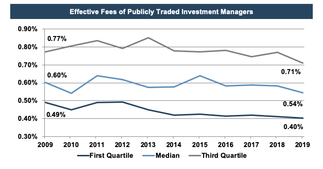 The popularity of passive funds increased in 2009 when the current bull market began. In 2010, about 30% of U.S. assets were held in passively managed funds; last year, we crossed the 50% mark. While active versus passive may still be an intellectual debate, there’s no debate that trillions of dollars are managed passively today at much lower fees than they were a decade ago. The chart below demonstrates the decline in publicly traded investment managers’ effective fees over the last ten years.