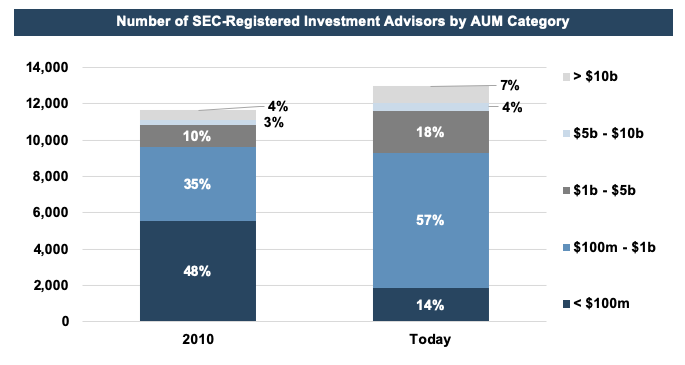 According to the Investment Advisor Association’s 2010 publication, SEC registered Investment Advisors reported $38.6 trillion in assets under management that year. Today, that number has more than doubled to $83.7 million. The number of SEC registered investment advisors, however, has only increased by 12% (11,643 in 2010 and 12,993 today). This means that the average advisor is managing more money today than they were ten years ago, as shown in the graph below.
