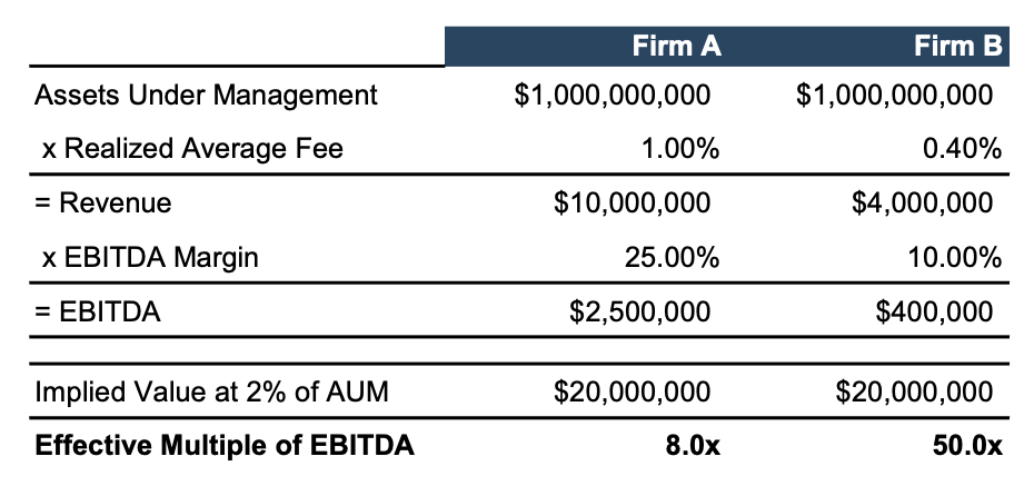 We have cautioned the use of AUM and Revenue-based multiples before, and an example has proven to be the best way to communicate the unreliability of such metrics. Consider, Firm A and Firm B, which both have the same AUM. Firm A has a higher realized fee than Firm B (100 bps vs 40 bps) and also operates more efficiently (25% EBITDA margin vs 10% EBITDA margin). The result is that Firm A generates $2.5 million in EBITDA versus Firm B’s $400 thousand despite both firms having the same AUM.