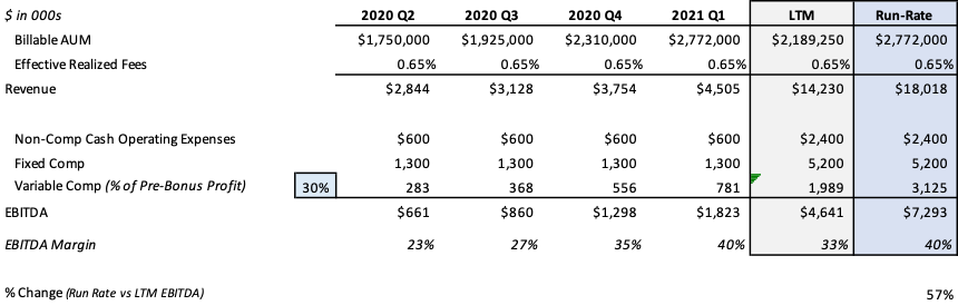 As of March 31, 2021, however, the firm’s run-rate performance was significantly higher than its performance over the last twelve months. ABC’s $2.8 billion in AUM was generating $18.0 million in annualized revenue at the effective realized fee level of 65 basis points. Assuming the same level of fixed costs and the appropriate increase in variable costs to reflect the higher revenue, ABC was producing run-rate EBITDA of $7.3 million at the end of the first quarter. That’s a 57% increase relative to EBITDA over the last twelve months.
