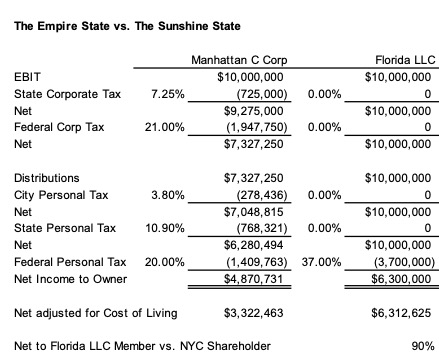 After-tax dividends/distributions to the Florida LLC member are about 30% higher than for a shareholder in a New York City C Corporation with the same EBIT (earnings before interest and taxes). But this differential is far greater if you consider the cost of living in Florida versus New York – a difference that will widen further if President Biden successfully rolls back some or all of the reduction in corporate taxes enacted in 2017.