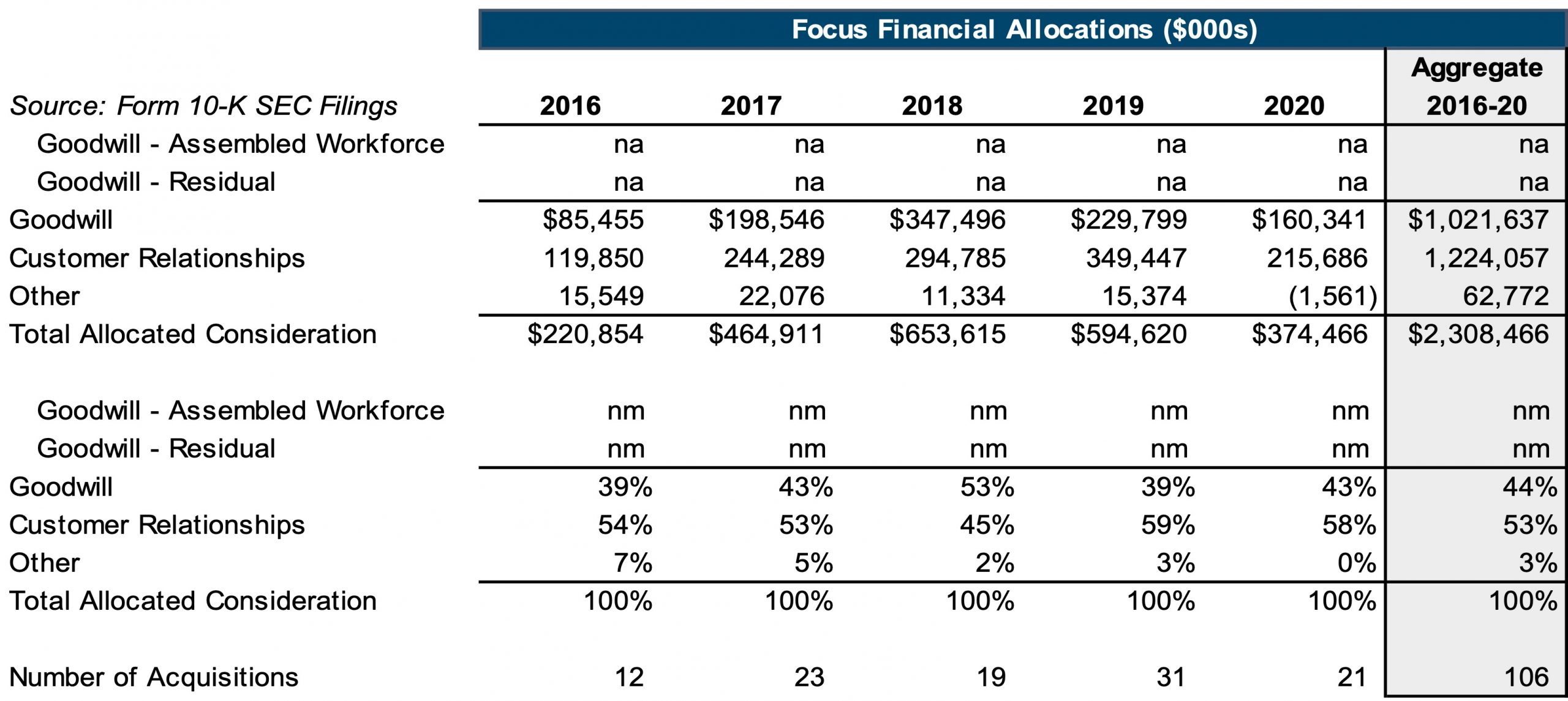 Due to their long-term nature, relatively low attrition rates, and importance as a driver of revenue in the asset and wealth management industries, customer relationships often command a relatively high portion of the allocated value. We can see this in the public filings of RIA aggregator Focus Financial. Between 2016 and 2020, Focus completed 106 acquisitions of RIAs. Of the aggregate allocated consideration for these transactions, a full 53% was allocated to customer relationships and 3% was allocated to other assets, with the remaining 44% comprising goodwill.