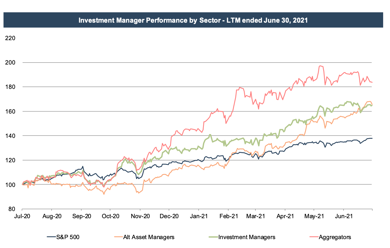 The second quarter was especially kind to the alt manager sector, which benefited from favorable market conditions and growing interest from institutional investors. Heightened volatility creates more opportunities for hedge funds to generate alpha (when their positions aren’t concentrated in meme stocks), and market peaks often spur interest in alternative asset classes, like private equity and real estate. These trends initially took root last fall before gaining considerable momentum in the second quarter.