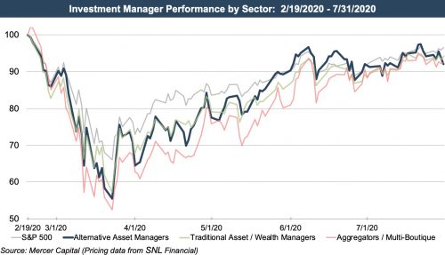 It’s also important to keep in mind that these alt managers and their assets are still vulnerable to bear markets. Public alt managers were particularly affected during the selloff last March, reflecting the decline in portfolio asset values and reduced expectations for realizing performance fees. From February 19, 2020 (the prior market peak), our index of alt managers declined nearly 45% in just over a month. Since then, an outsized recovery has pushed the index back to all-time highs.