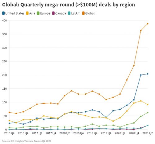 Much of this momentum is attributable to the VC space as investors turn to private equity and start-up tech firms for higher returns than more traditional asset classes. According to CB Insights, a record 249 firms achieved the $1 billion “unicorn” valuation status in the first half of 2021, almost doubling the total tally from last year.