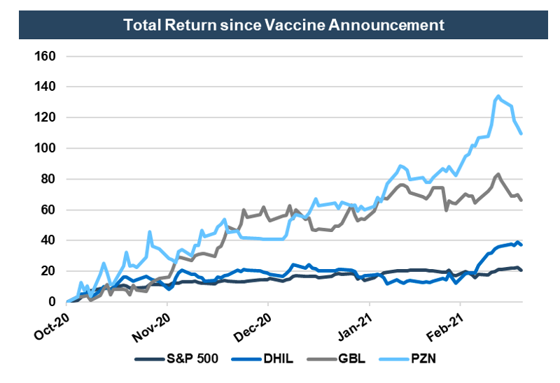 Value firms, on the other hand, are finally starting to shine. After years of outflows and subpar returns, publicly-traded value managers, Gabelli (GBL), Diamond Hill (DHIL), and Pzena (PZN) have significantly outperformed the S&P 500 (navy blue line below) since the vaccine announcement in early November.