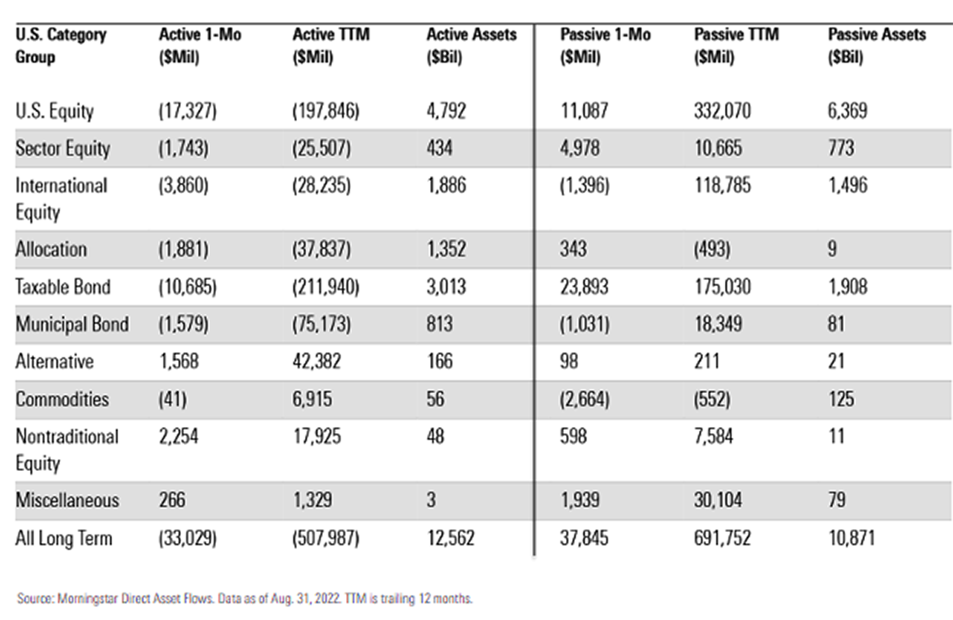 One bright spot for asset managers in 2022 is that many more active managers are beating passives. So far in 2022, Morningstar reports that nearly two-thirds of large cap value PMs are beating the Russell 1000 value index, and just over half of large blend managers are beating the S&P 500. Unfortunately, this “beat” means being less down than the index, and despite the win passive strategies are having more success in attracting funds.