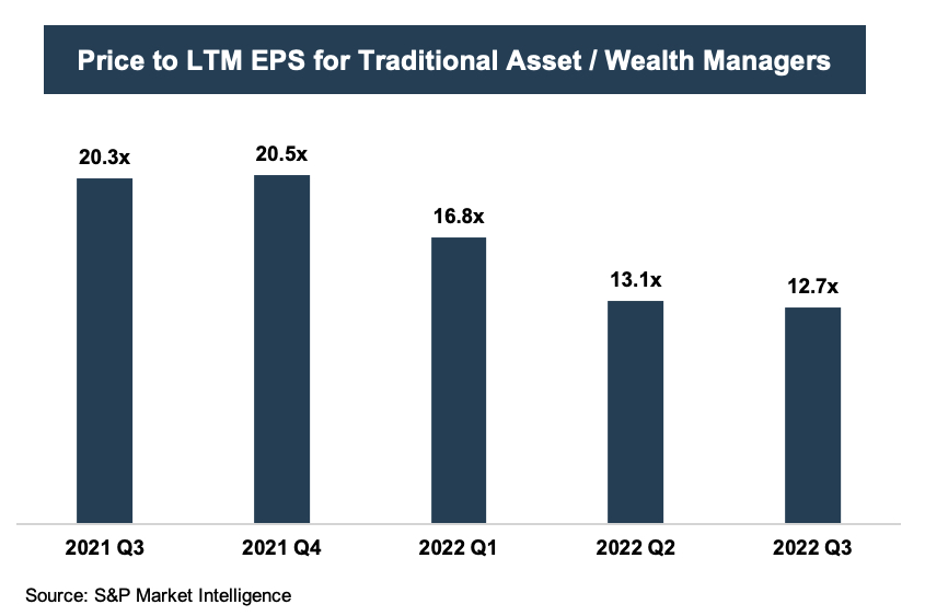 As valuation analysts, we are often interested in how earnings multiples have evolved over time since these multiples can reflect market sentiment for the asset class.  After steadily increasing over the second half of 2020 and throughout 2021, LTM earnings multiples for publicly traded asset and wealth managers have dropped nearly 40% this year, reflecting investor anticipation of lower revenue and earnings from the recent market decline and rising cost structure.