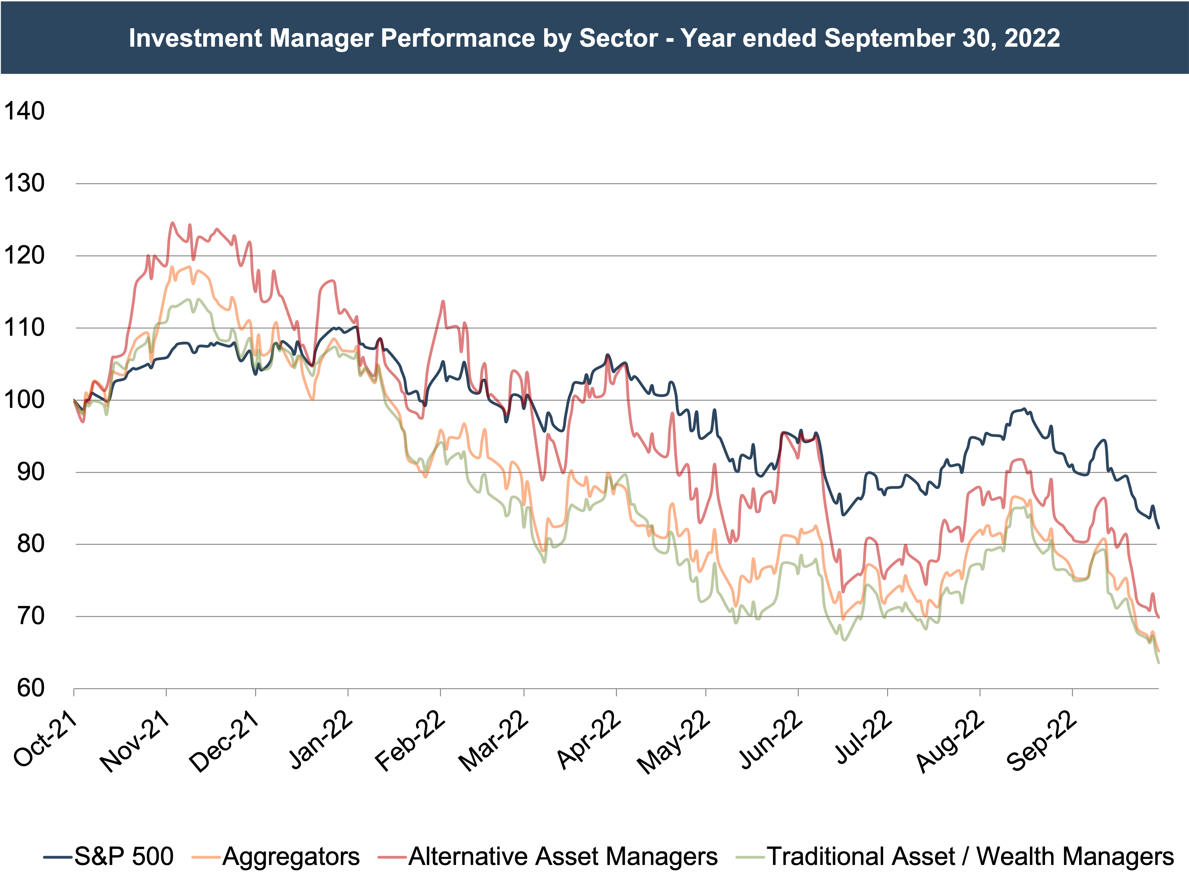 The market itself is part of the problem as this industry is mostly invested in stocks and bonds, which have been down considerably since the first of the year.  The additional underperformance for asset and wealth managers is likely attributable to lower industry margins as AUM and revenue fall with the market while labor costs continue to rise.  Rising interest rates have exacerbated this decline for alternative asset managers and RIA aggregators, who frequently employ leverage to make investments.