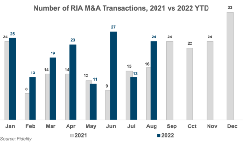 Year-to-date RIA M&A activity has surpassed last year’s record levels in 2022, even as macro headwinds for the industry continue to mount. Fidelity’s August 2022 Wealth Management M&A Transaction Report listed 155 deals through August of 2022, up from 112 during the same period in 2021. These transactions represented $212 billion in AUM, up 16% from 2021 levels.