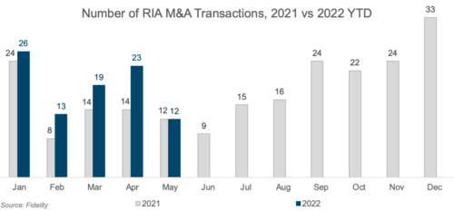 Year-to-date RIA M&A activity has surpassed last year’s record levels so far in 2022 even as macro headwinds for the industry continue to mount. Fidelity’s May 2022 Wealth Management M&A Transaction Report listed 93 deals through May of 2022, up from 72 during the same period in 2021. These transactions represented $135 billion in AUM, up 12% from 2021 levels.