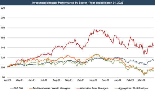 While wealth management continues to benefit from demographic trends in the U.S. and the general accumulation of investible assets during the pandemic, 2022 is proving to be somewhat more difficult for the sector, and sentiment among investors in wealth management firms has dimmed.
