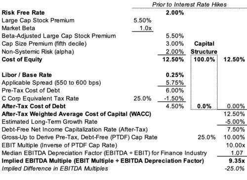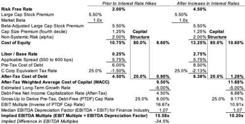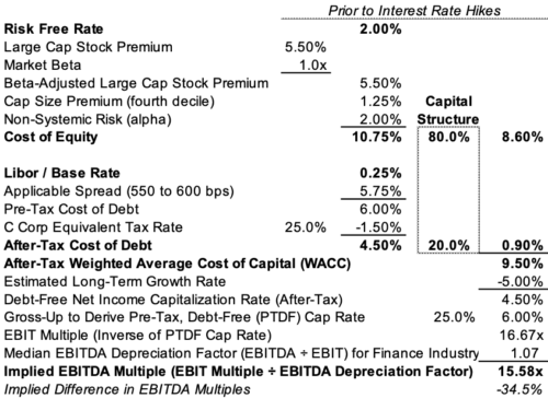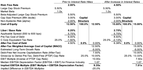 Of course, this illustration derives an implied EBITDA multiple prior to expected increases in interest rates. As noted below, a 2.5% increase in the federal funds rate (which we’re using to approximate changes in the risk-free rate here) results in a 25% decrease in the EBITDA multiple (holding everything else constant) even though we’ve assumed no interest-bearing debt in the capital structure. The reason is higher interest rates raise an RIA’s cost of equity capital because investors in these businesses will require the same incremental return over riskless alternatives to induce investment, so a higher risk-free rate means a higher required return on RIA investments. Sellers will have to offer lower prices to satisfy a buyer’s need for an increased return, and the EBITDA multiple (assuming no changes in EBITDA) will fall with the transaction price.