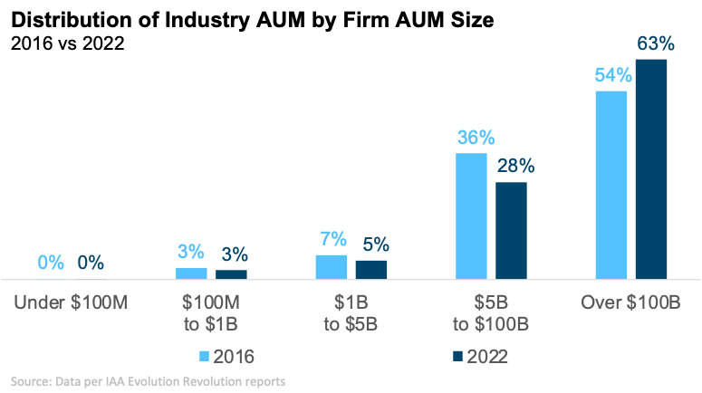 These wrinkles aside, the data is unambiguous that there are more SEC-registered advisory firms today than ever before—and that’s hardly indicative of an industry in the throes of consolidation. Another way to track consolidation is to look at how assets under management are distributed across firms of different sizes rather than at the number of firms.  By this metric, there has been some degree of consolidation: the largest firms (those over $100B) have increased their share of industry assets from 54% in 2016 to 63% in 2022.