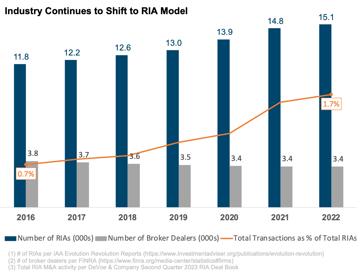 This overarching shift from the broker-dealer model to the RIA model is multi-faceted.  For one, it’s clear that clients (in general) prefer the advisory relationship offered by RIAs over that offered by their broker-dealer counterparts.  And a model that’s in demand by clients is also in demand by advisors.  Additionally, we’ve found that building significant enterprise value (value attributable to the business, not the individual) is generally easier for firm owners to achieve under the RIA revenue model than the broker-dealer model.