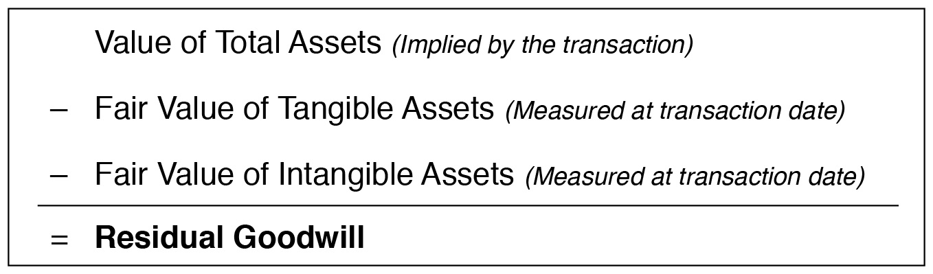 A purchase price allocation is just that—the purchase price paid for the acquired business is allocated to the acquired tangible and separately-identifiable intangible assets. The following figure notes that the acquired assets are measured at fair value. The excess of the purchase price over the identified tangible and intangible assets is referred to as goodwill.