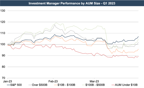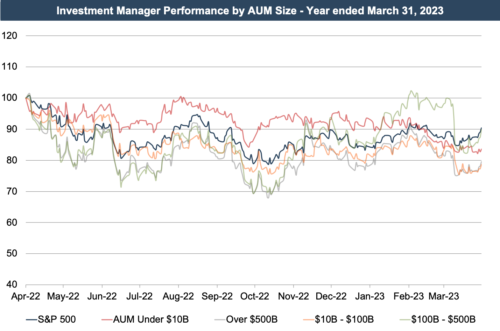 RIAs of all asset sizes underperformed the S&P 500 during Q1 2023.  Smaller managers (below $100B AUM) saw a moderate decline, while larger asset managers (above $100B AUM) experienced a modest increase in price during the period.  Up until the first week of March, asset managers between $100B and $500B AUM had been outperforming the S&P 500.  With the events surrounding the failure of Silicon Valley Bank and Signature Bank in early March, this class of asset managers saw the sharpest decline in price, causing the group to ultimately underperform the S&P 500 by the end of the quarter.  This group still outperformed other AUM groups, though.  The full-year graph below shows that the smallest asset managers (below $10B AUM) outperformed the S&P 500 for most of 2022.  This trend did not continue into Q1 2023.