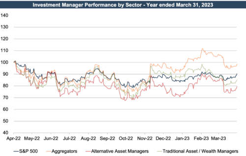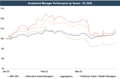 The RIA industry saw a tumultuous first quarter, with most categories of publicly traded investment managers underperforming the S&P 500.  Alternative asset managers, however, saw a last-minute rally during the final few days of the quarter, leading to this category outperforming the S&P during the period.